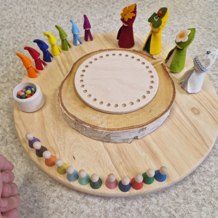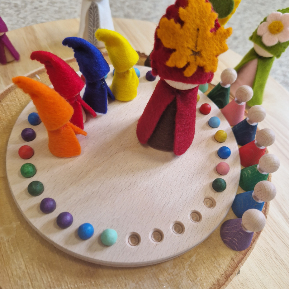 Mit unseren kleinen Wichteln bestimmen wir unsere Tage, Monate und die Jahreszeiten. In der Mitte liegen kleine Kugeln - für jeden Tag gibt es eine Kugel.